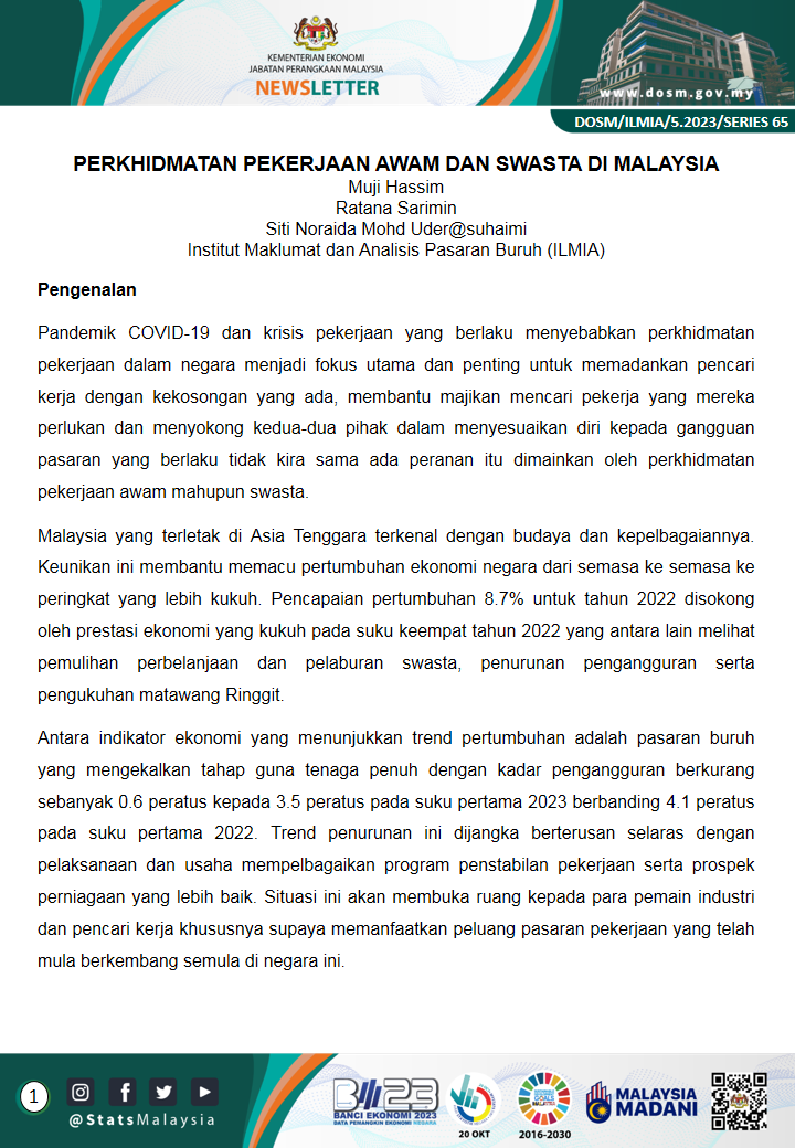 DOSM/ILMIA/5.2023/SERIES 65 - Perkhidmatan Pekerjaan Awam dan Swasta Di Malaysia