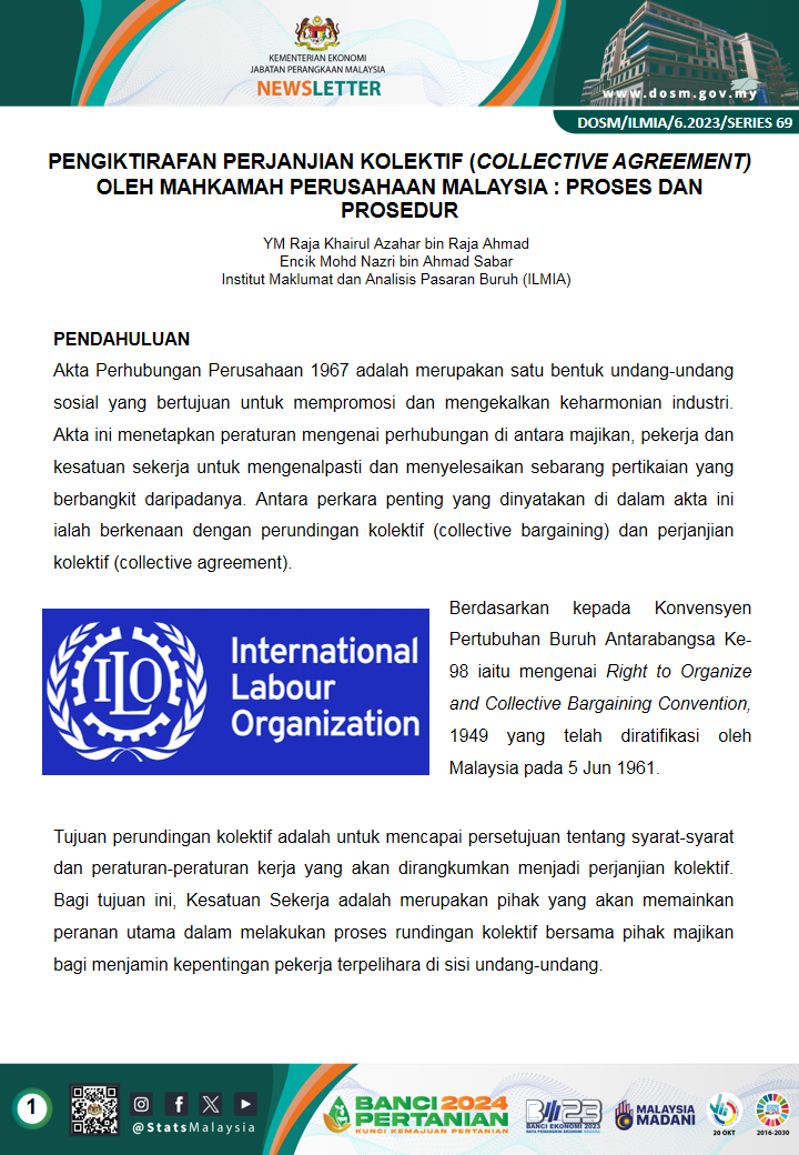 DOSM/ILMIA/6.2023/SERIES 69 - PENGIKTIRAFAN PERJANJIAN KOLEKTIF (COLLECTIVE AGREEMENT) OLEH MAHKAMAH PERUSAHAAN MALAYSIA PROSES DAN PROSEDUR