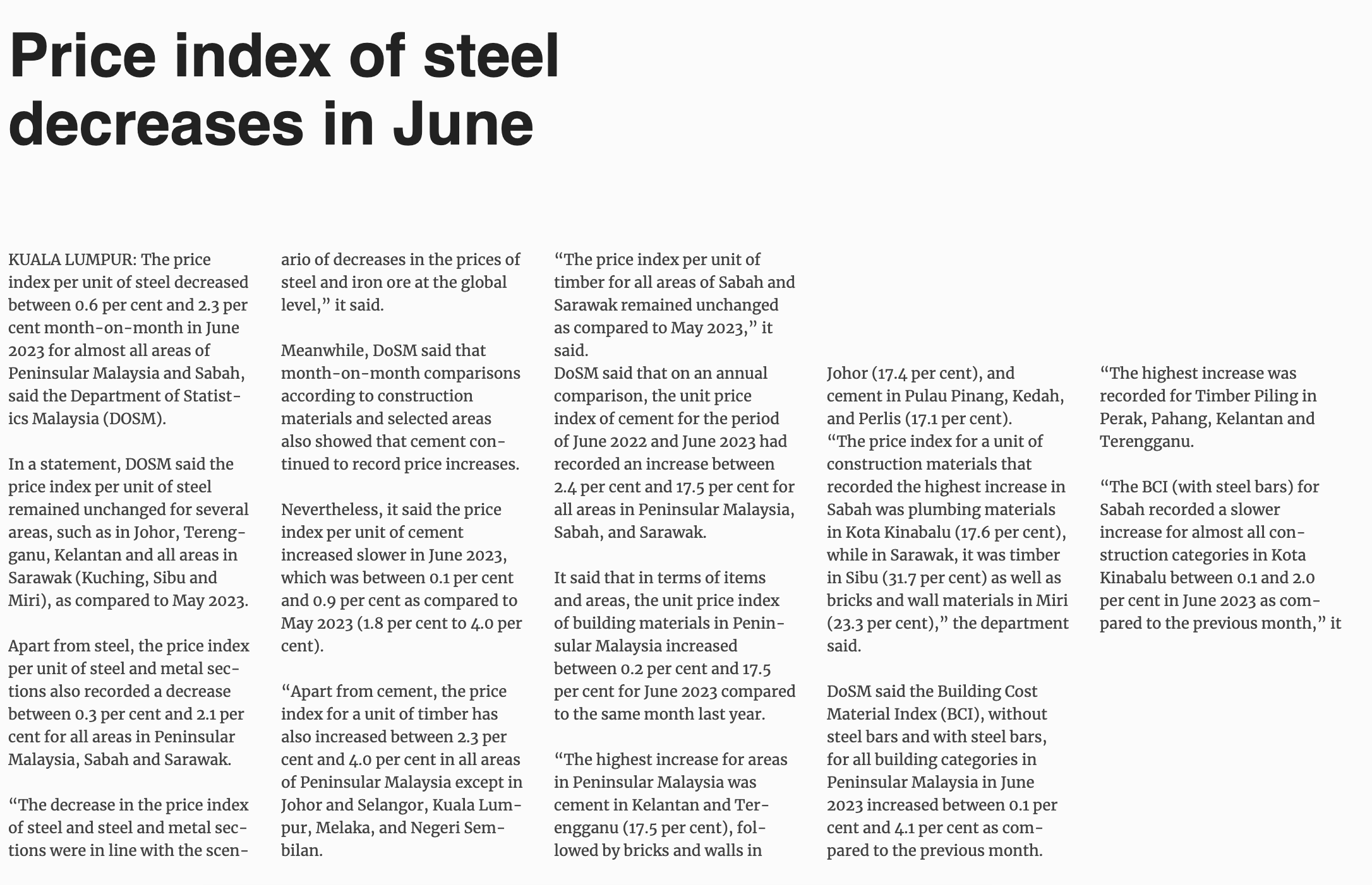 Price index of steel decreases in June