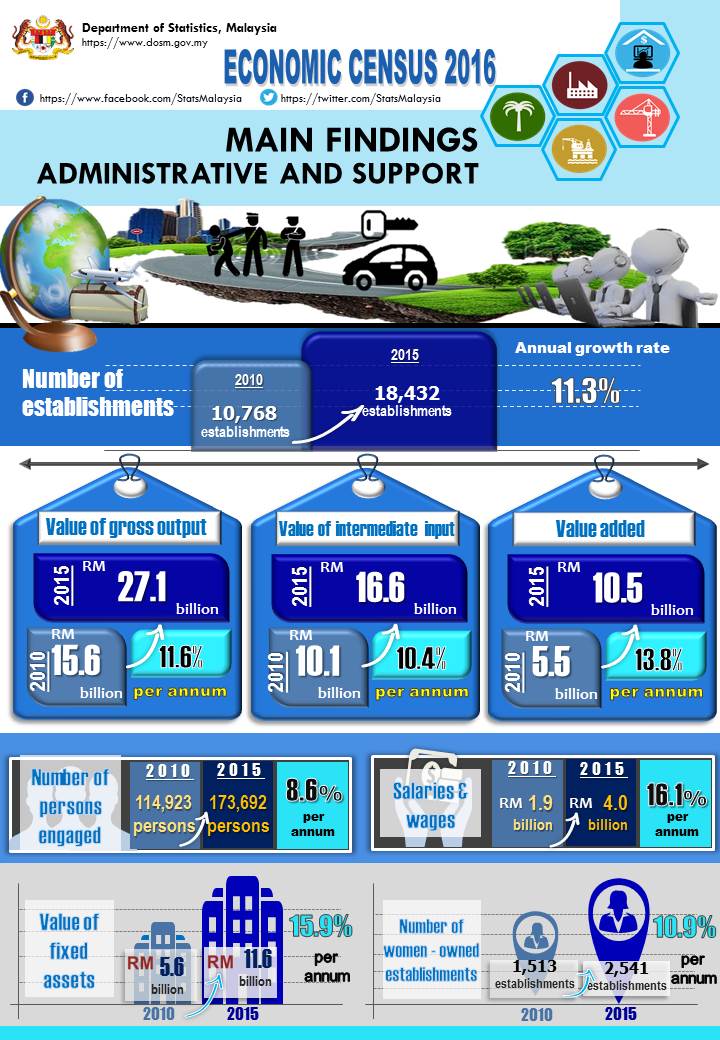 This publication presents statistics on administrative and support services resulted from the Economic Census undertaken in 2016 for reference year 2015. Administrative and support services encompass of rental & leasing activities; employment activities; travel agency, tour operator & reservation service activities; security & investigation activities; services to buildings & landscape activities; and office administrative & other business support activities.
