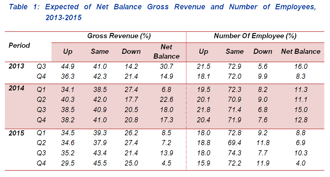 A total of 29.6 per cent of establishments reported an improvement in their business gross revenue. In contrast, 33.2 per cent of establishments have reported deterioration in their gross revenue condition and 37.2 per cent of establishments stated their gross revenue remain the same in the third quarter of 2015. This translates to a net balance of -3.6 per cent as compared to +2.0 per cent in the previous quarter.