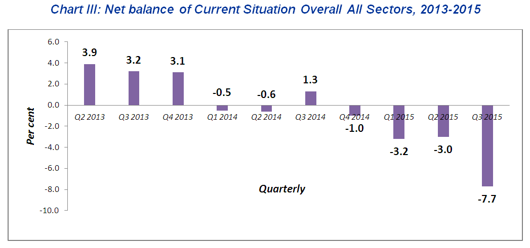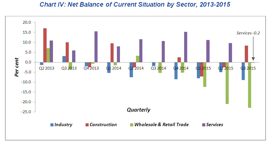 At sectors level, business current situation of wholesale & retail trade, industry and services has deteriorated during the third quarter 2015 with a net balance of -22.9 per cent, -8.9 per cent and -0.2 per cent respectively. In contrast, the construction sector has reported a better net balance of +8.3 per cent (Chart IV).