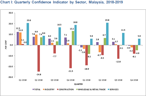 All sectors except Services sector, posted lower confidence indicator in the fourth quarter of 2019. The Construction sector remains negative with the confidence indicator registered -8.1 per cent in the reference quarter. The Wholesale & Retail Trade Sector also shows a decline with the confidence indicator recorded at -4.9 per cent in the fourth quarter compared to -0.1 per cent in the previous quarter. Concurrently, the Industry indicates less favourable, with confidence indicators dropped to -2.2 per cent from +0.7 per cent recorded in the third quarter of 2019.