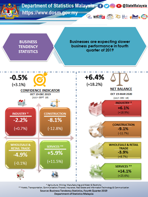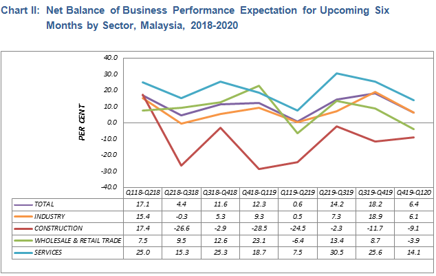 Business performance is forecasted to be expanding at a lesser positive in October 2019 to March 2020 with an overall net balance of +6.4 per cent as compared to +18.2 per cent recorded in the previous survey result. The Industry and Services sectors anticipate their business situations to be positive with a net balance of +6.1 per cent and +14.1 per cent respectively.