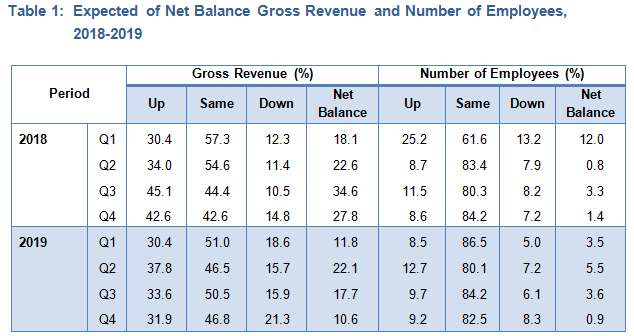 Overall, respondents mainly Services sector expect gross revenues to increase in the fourth quarter of 2019 with a net balance of +10.6 per cent. Out of the figure, 31.9 per cent of respondents anticipate that their gross income to increase and 21.3 per cent demonstrate otherwise. Meanwhile, 46.8 per cent of respondents expect that their gross income will remain the same.