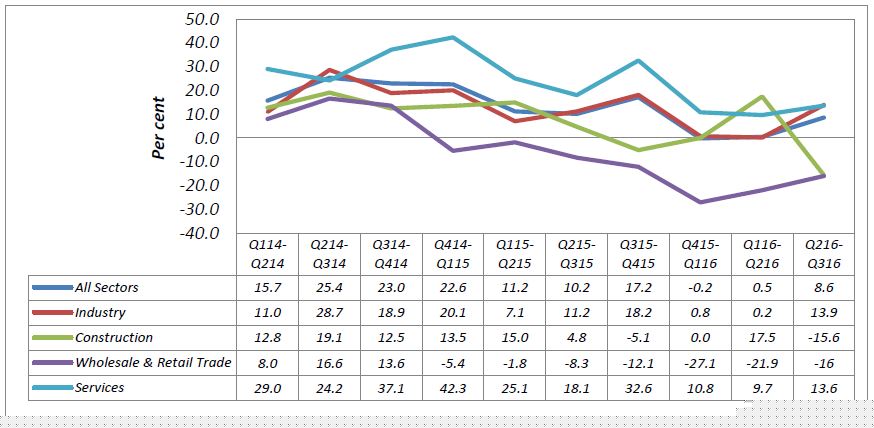 The difference between the percentages of establishments giving favorable and unfavorable response known as the net balance. The expectations for second quarter of 2016 showed an increase in the net balance of +11.4 per cent compared to -0.7 per cent in the previous quarter.