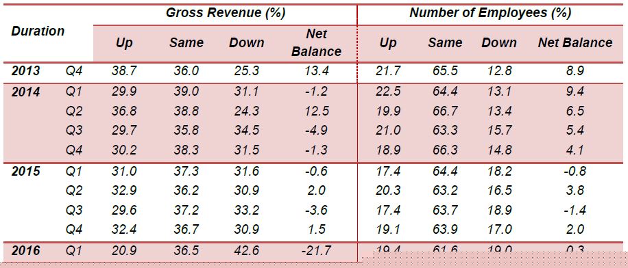 In the first quarter of 2016, the establishments reported that they experienced a decline in gross revenue with a net balance of -21.7 per cent as compared to +1.5 per cent in the previous quarter. A total of 20.9 per cent of establishments reported gross revenue of their business increased in the first quarter of 2016. In contrast, 42.6 per cent of establishments reported deterioration. Meanwhile, 36.5 per cent of establishments stated their business gross revenue remained the same.
