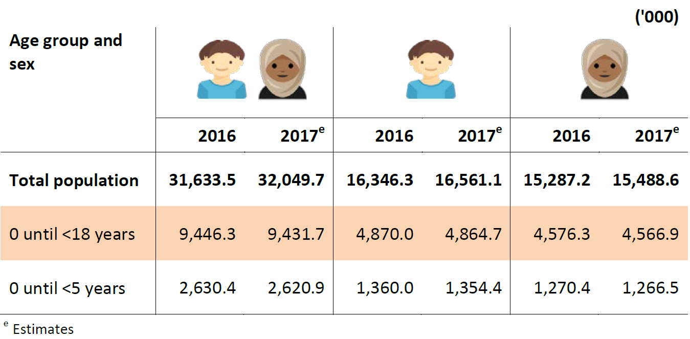 In 2017, the composition of children under 18 years is 29.4 per cent, that is 9.4 million children out of 32.0 million population. In terms of sex, the number of male children (4.9 million persons) is more than females (4.6 million persons).