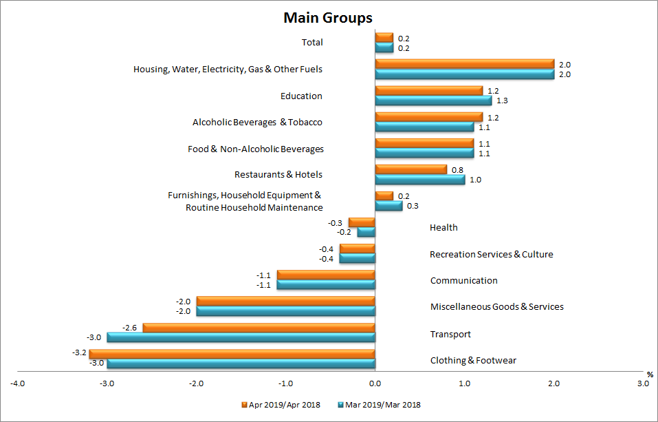 Consumer Price Index (CPI) rose by 0.2 per cent in April 2019 to 121.1 as compared to 120.9 in the same month of the preceding year. The main groups that contributed to the increases were Housing, Water, Electricity, Gas & Other Fuels (+2.0 per cent), Alcoholic Beverages & Tobacco (+1.2 per cent), Education (+1.2 per cent), Food & Non-Alcoholic Beverages (+1.1 per cent) and Restaurants & Hotels (+0.8 per cent). (Chart 1).