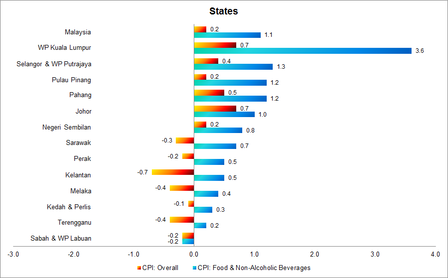 Four states namely Wilayah Persekutuan Kuala Lumpur (+0.7 per cent), Pulau Pinang (+0.7 per cent), Negeri Sembilan (+0.5 per cent) and Selangor & Wilayah Persekutuan Putrajaya (+0.4 per cent) surpassed the national CPI rate of 0.2 per cent in April 2019 as compared to April 2018. Meanwhile, Johor and Perak showed the same rate of increase as the national CPI.