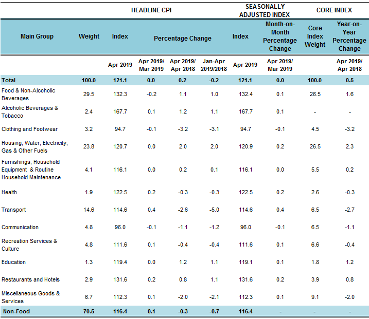 On a monthly basis, CPI remains unchanged as compared to March 2019. Meanwhile, CPI for the period of January - April 2019 registered a decrease of 0.2 per cent as compared to the same period last year.