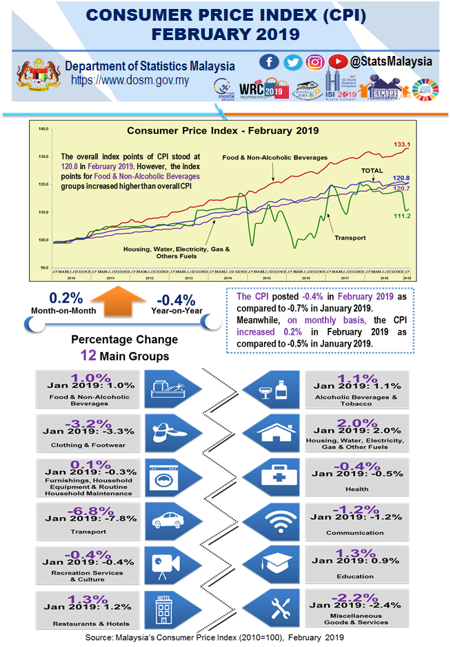 The overall index for Consumer Price Index (CPI) posted -0.4 per cent in February 2019 as compared to -0.7 per cent in the previous month. In terms of index number, the CPI recorded 120.8 as against 121.3 in corresponding month of the preceding year. The decrease in the index of Transport (-6.8 per cent) which contributed 14.6 per cent of overall weight was countered by the increase in the index of Housing, Water, Electricity, Gas & Other Fuels (+2.0 per cent) and Food & Non-Alcoholic Beverages (+1.0 per cent).