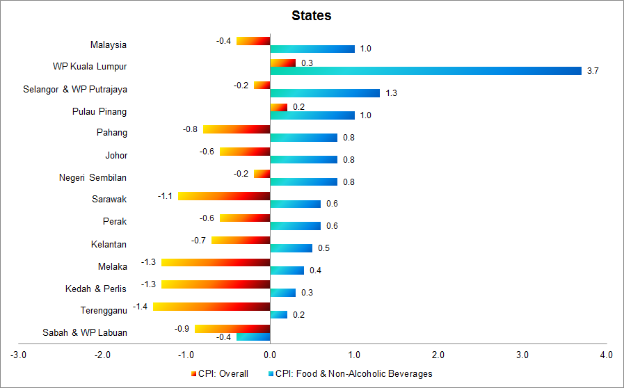 All states recorded a decrease between -0.2 per cent to -1.4 per cent in February 2019 as compared to the same month in the previous year. However, Wilayah Persekutuan Kuala Lumpur and Pulau Pinang showed an increase of 0.3 per cent and 0.2 per cent respectively.