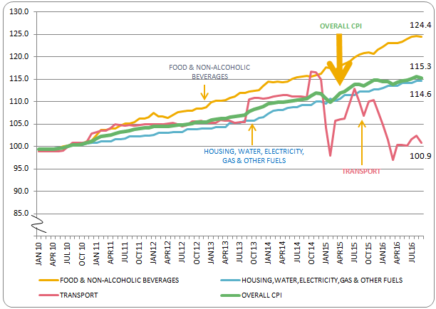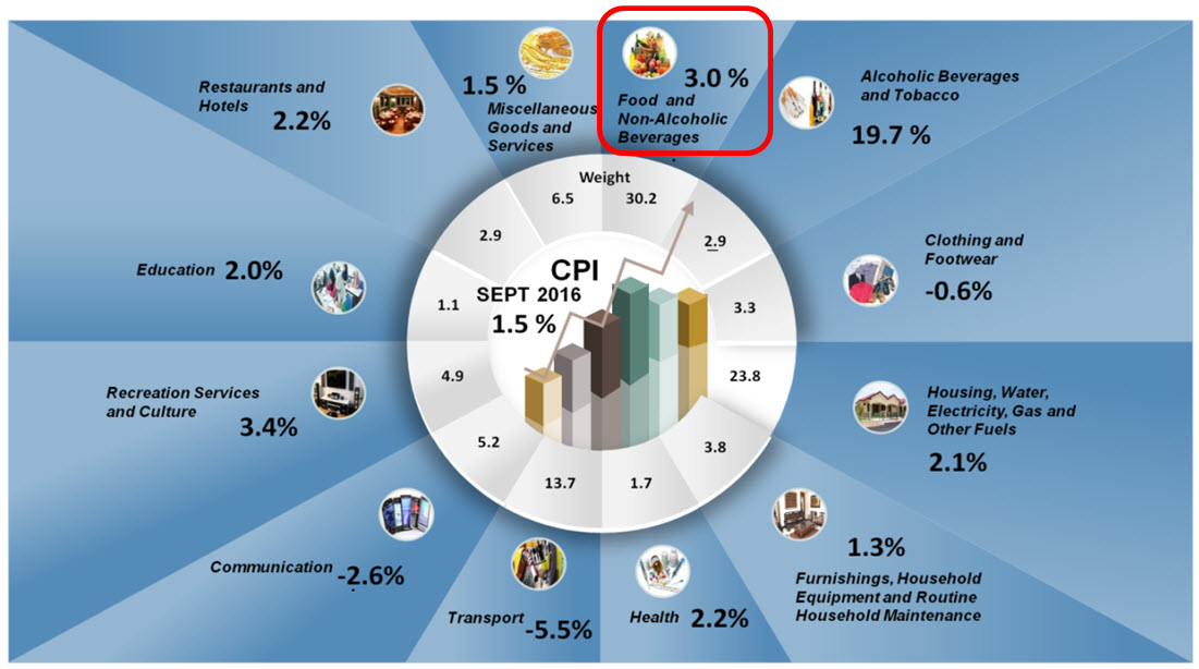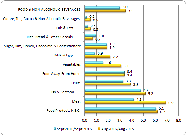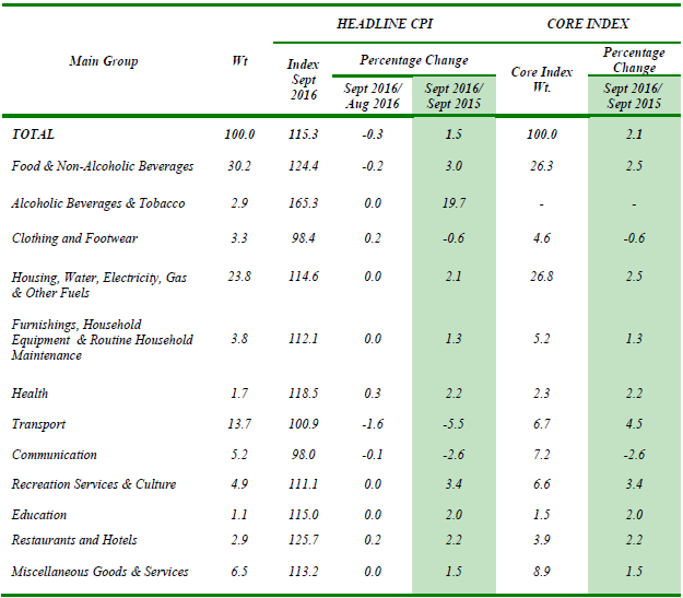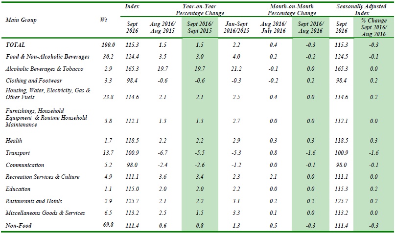 CPI increased at the same pace of 1.5 per cent in September 2016, however the index for Food & Non-Alcoholic Beverages recorded a rate of 3.0 per cent.