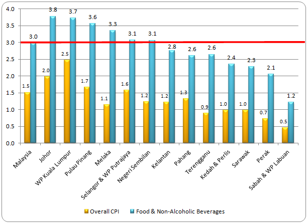 The index for Food & Non-Alcoholic Beverages recorded an increase higher than the rate of overall CPI. The increase in the index for Food & Non-Alcoholic Beverages was reflected in each state in Malaysia especially those in highly urbanised states such as Wilayah Persekutuan Kuala Lumpur, Selangor & Wilayah Persekutuan Putrajaya, Pulau Pinang and Johor.