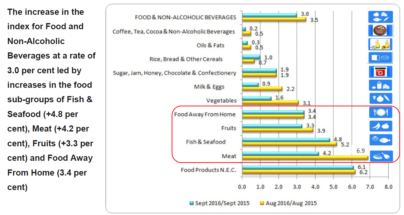 The index for Food & Non-Alcoholic Beverages increased 3.0 per cent in the September 2016. The increase was led by increases in food sub-groups namely, Fish & Seafood (+4.8 per cent); Meat (+4.2 per cent) and Fruits (+3.3 per cent). Meanwhile, the index for Food Away From Home continued to rise in September 2016, increased by 3.4 per cent.