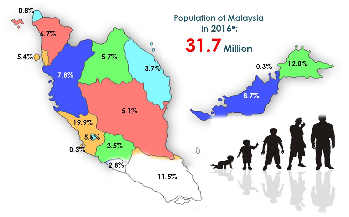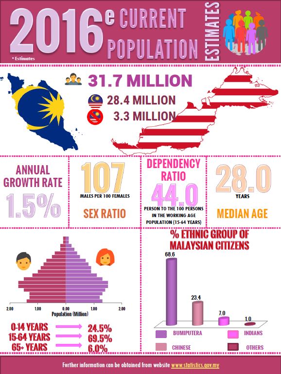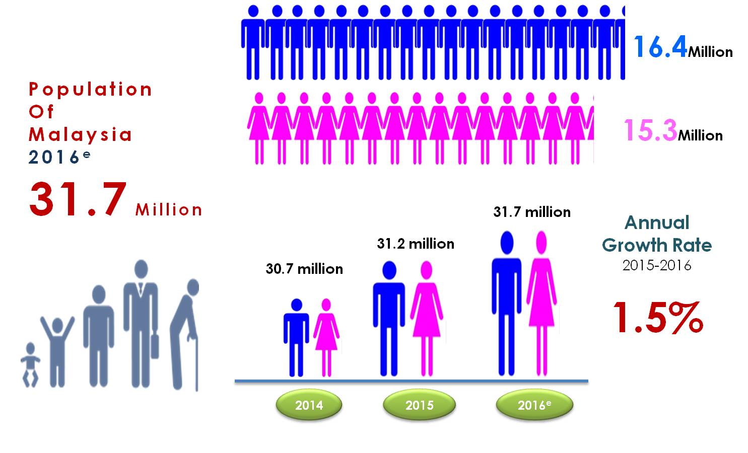 In 2016, total population of Malaysia is estimated at 31.7 million persons, an increase of 0.5 million persons as compared to 31.2 million persons in 2015 with 1.5 per cent population growth rate for the same period.