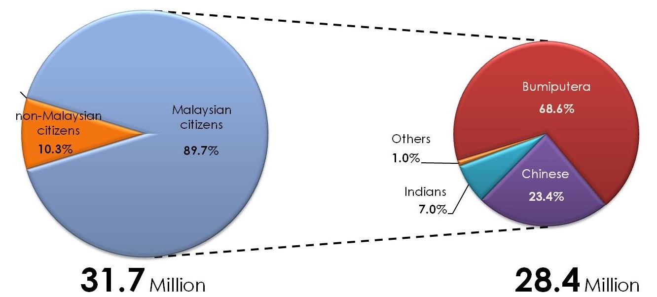 Among Malaysian citizens, ethnic Bumiputera recorded the highest percentage with 68.6 per cent, followed by Chinese (23.4 %), Indians (7.0 %) and Others (1.0 %). The percentage of non-Malaysian citizen in 2016 was at 10.3 per cent out of total population in Malaysia.