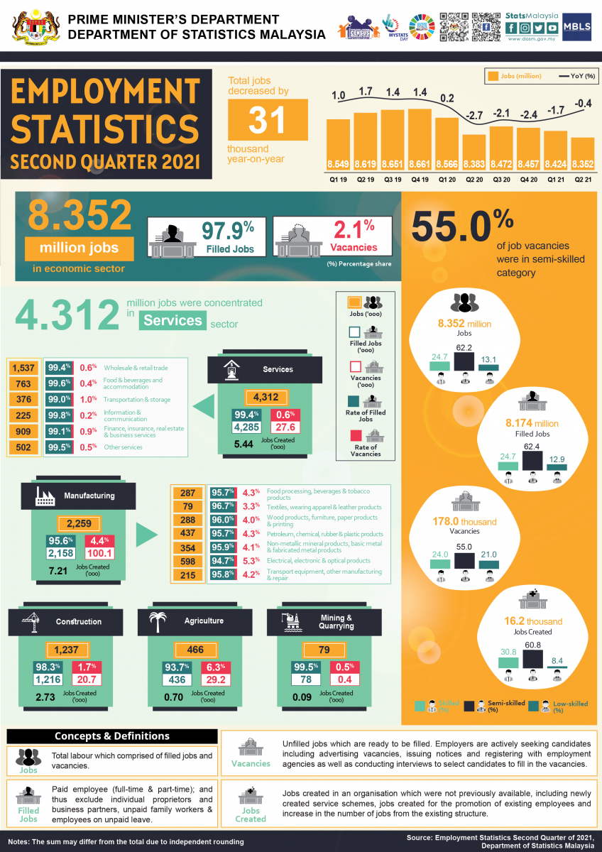 The detailed information and technical notes are published in the publication of Employment Statistics, Second Quarter 2021. This publication is accessible and downloadable free of charge through the eStatistik application in DOSM web page, www.dosm.gov.my.