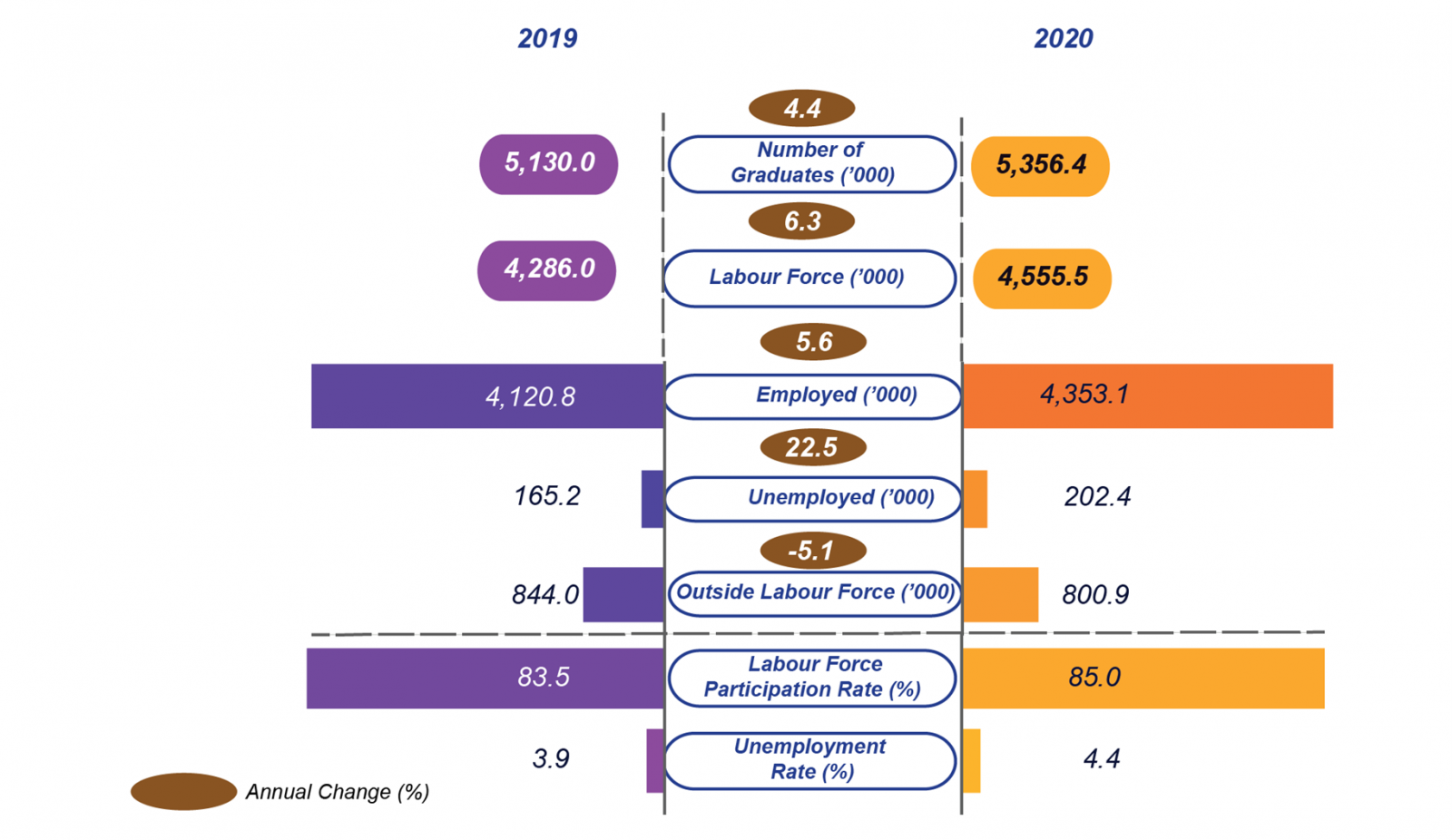 The number of employed graduates was 4.35 million persons, increased by 5.6 per cent from 4.12 million persons in 2019. Meanwhile, graduates’ unemployment rate spike to 4.4 per cent with the number of unemployed graduates was 202.4 thousand persons (2019: 165.2 thousand persons; 3.9%).