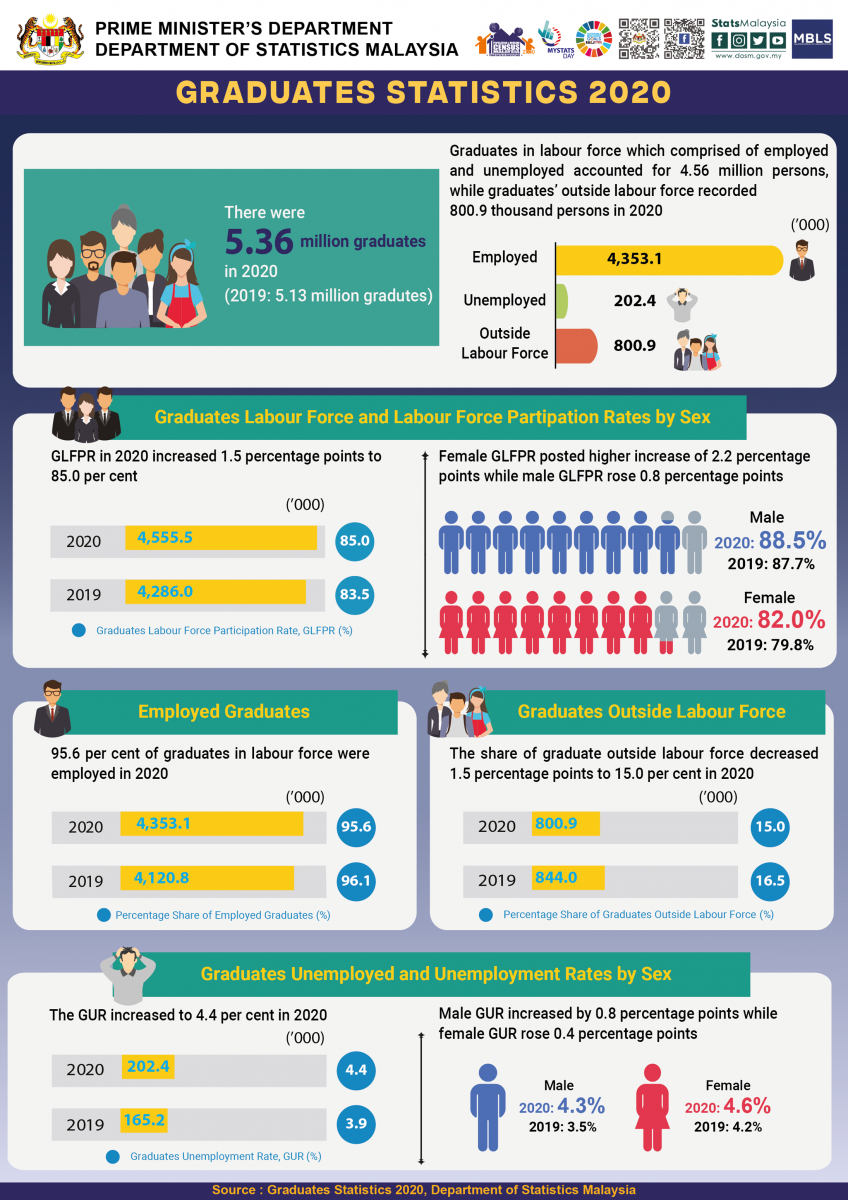The number of graduates in Malaysia in 2020 was 5.36 million persons, increased by 4.4 per cent from 2019 (5.13 million persons). The number of graduates in the labour force encompassed of employed and unemployed, rose by 6.3 per cent to record 4.56 million persons (2019: 4.29 million persons). In the meantime, graduates’ labour force participation rate (GLFPR) went up by 1.5 percentage points to 85.0 per cent as compared to 83.5 per cent in 2019.