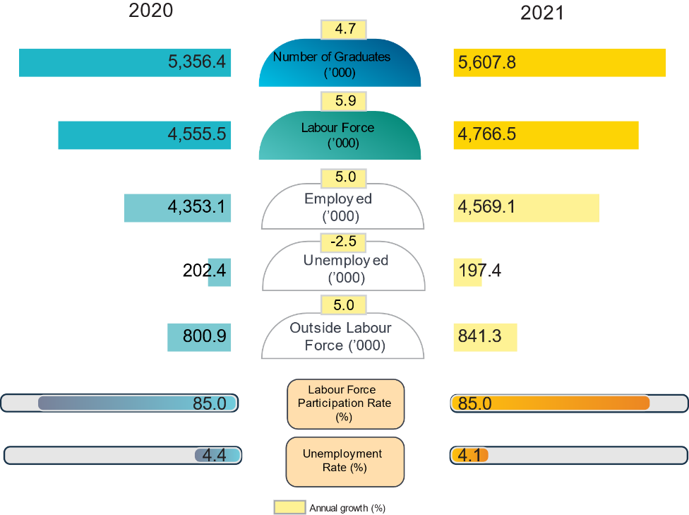 Employed graduates went up by 5.0 per cent as against 2020 to register 4.57 million persons (2020: 4.35 million persons). On the other hand, graduates’ unemployment rate eased to 4.1 per cent as compared to 4.4 per cent recorded in the preceding year. Accordingly, the number of unemployed graduates reduced by 2.5 per cent (-5.0 thousand) to 197.4 thousand persons as opposed to 202.4 thousand unemployed graduates in 2020.
