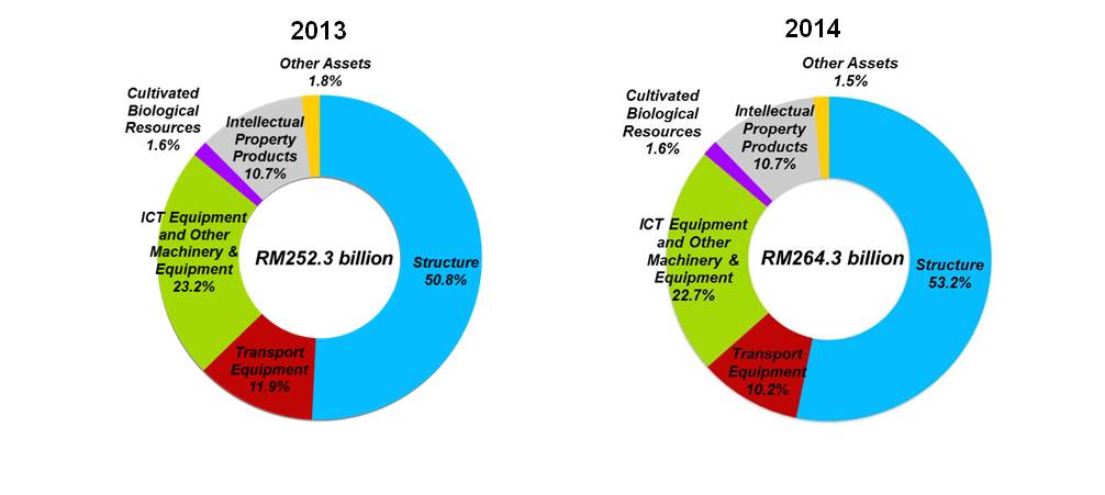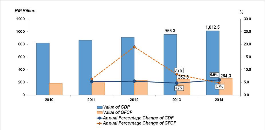 In 2014, GFCF grew by 4.8 per cent (constant prices) with a value of RM264.3 billion (Chart 1). In current terms, value of GFCF stood at RM287.5 billion.