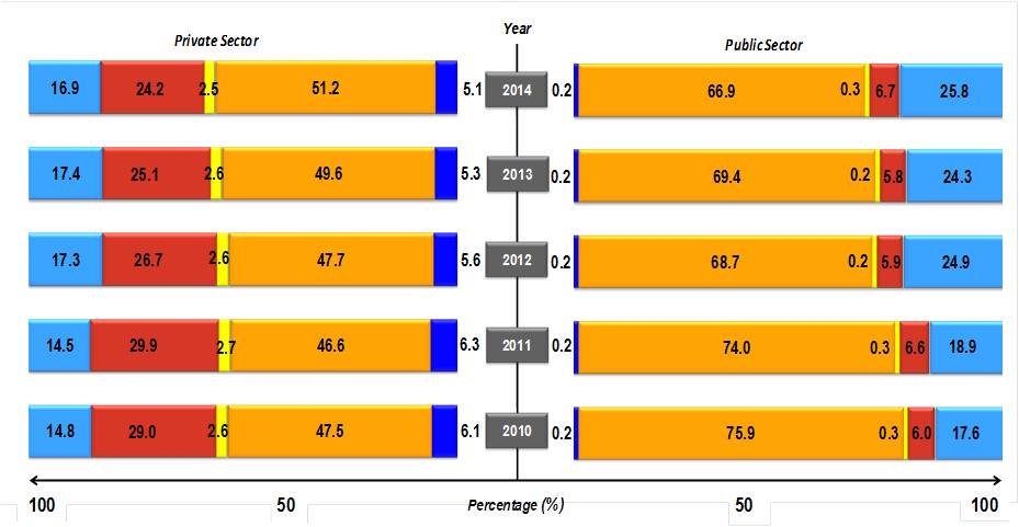 GFCF of Public sector was largely dominated by Services and Mining & Quarrying with a share of 66.9 per cent and 25.8 per cent, respectively. Manufacturing as the third contributor climbed to 6.7 per cent as compared to 5.8 per cent in 2013.