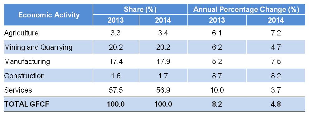 GFCF by activity marked the Services sector remained as the significant contributor to the growth, followed by Manufacturing and Mining & Quarrying. During 2014, Private sector investment continued as the catalyst towards total investments.