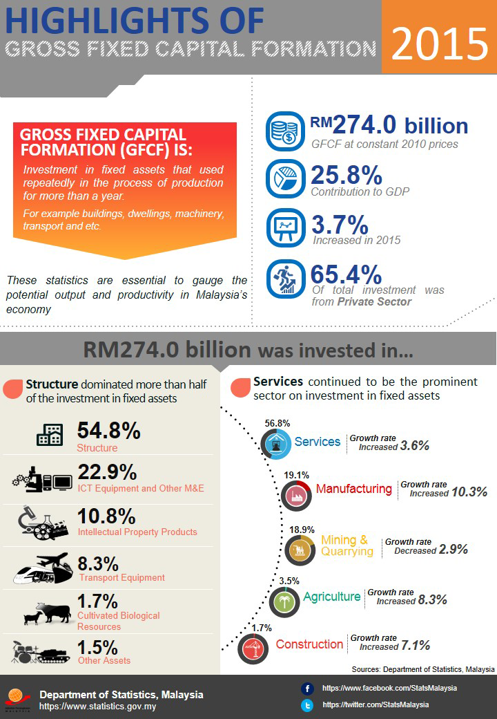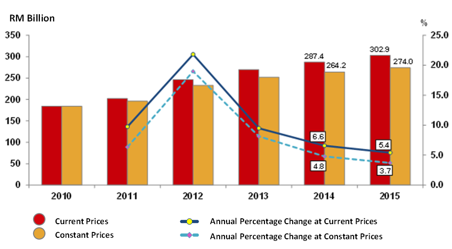 Malaysia’s GFCF recorded a value of RM302.9 billion (current prices), an increase of RM15.5 billion from year 2014 and GFCF at constant prices amounted to RM274.0 billion (Chart 1).