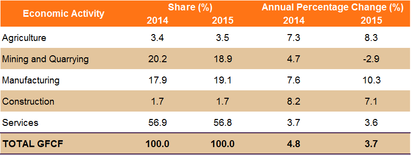 GFCF posted a growth of 3.7 per cent in 2015 (2014: 4.8%) led by acquisition of fixed assets in Services, Manufacturing and Agriculture. Private sector remained as the key driver in GFCF by sector, while Structure was the anchor for type of assets.