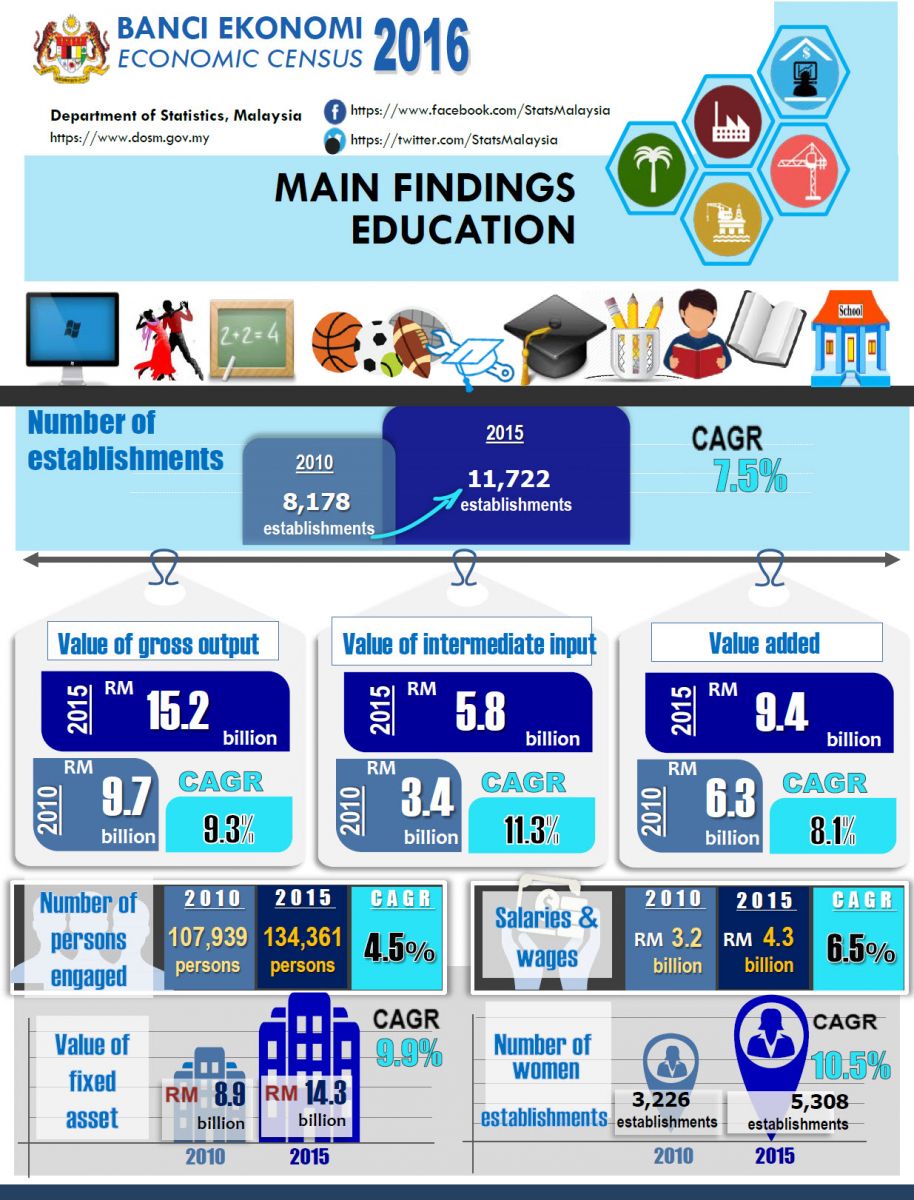 Value of gross output generated for education services was RM15.2 billion, registering a CAGR of 9.3 per cent. In line with value of gross output, value added for these services was RM9.4 billion. There was an increase of RM3.1 billion from 2010, with a CAGR of 8.1 per cent.