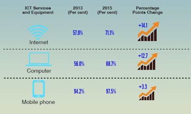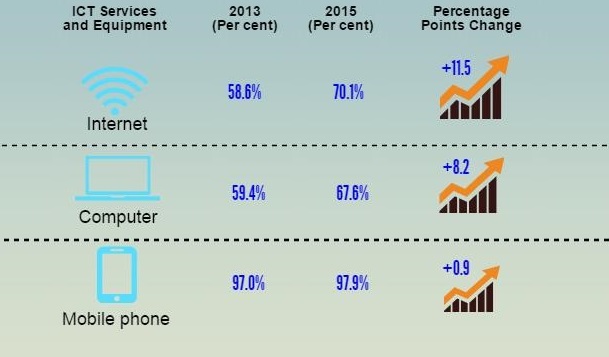 Percentage of household access to Internet increased by 11.5 percentage points to 70.1 per cent in 2015 compared to 58.6 per cent in 2013. Household access to computer increased by 8.2 percentage points from 59.4 per cent in 2013 to 67.6 per cent in 2015. Percentage of household access to mobile phone almost saturated with 0.9 percentage points increased to 97.9 per cent in 2015 compared to 97.0 per cent in 2013.