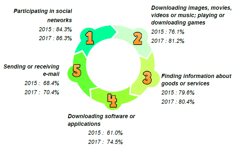 In 2017, among the popular Internet activities carried out by the Internet user were participating in social networks (86.3%), downloading images, films, video or music; playing or downloading games (81.2%), getting information about goods and services (80.4%), downloading software or applications (74.5%) and sending or receiving e-mails (70.4%).