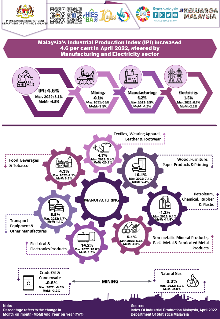 Malaysia's Industrial Production Index (IPI) increased 4.6 per cent in April 2022, steered by Manufacturing and Electricity sector