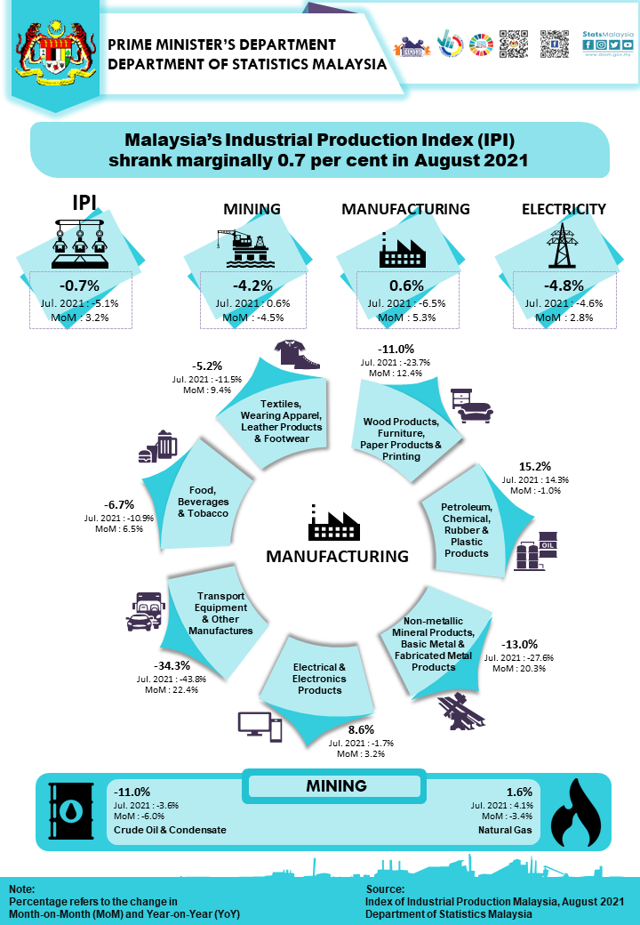 Malaysia’s Industrial Production Index (IPI) shrank marginally 0.7 per cent in August 2021