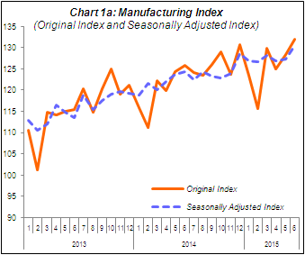 PERFORMANCE OF MANUFACTURING SECTOR Year-on-year, Manufacturing sector output edged up to 4.9% in June 2015 after an increase of 3.2% registered in May 2015. The major sub-sectors showed an increase in June 2015 were: Electrical and Electronics Products (6.1%); Food, Beverages and Tobacco (11.2%) and Petroleum, Chemical, Rubber and Plastic Products (2.2%). On a seasonally adjusted month-on-month basis, Manufacturing output grew by 2.5% in June 2015. |