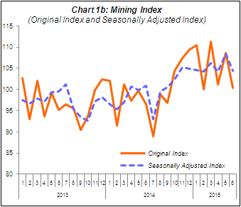 PERFORMANCE OF MINING SECTOR The Mining sector output increased by 4.0% in June 2015 compared to the same month in 2014. This expansion was mainly due to the increase of Crude Oil index (6.6%) and Natural Gas index (1.0%). As against May 2015, seasonally adjusted output for the Mining sector declined by 3.7%. |