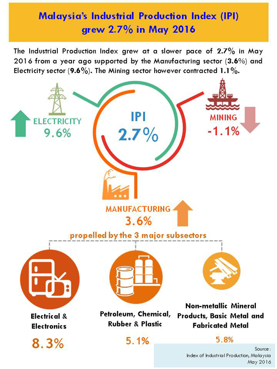 Malaysia’s Industrial Production Index (IPI) grew 2.7% in May 2016