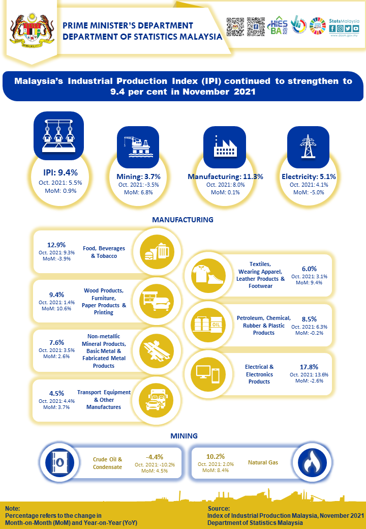 Malaysia’s Industrial Production Index (IPI) continued to strengthen to 9.4 per cent in November 2021