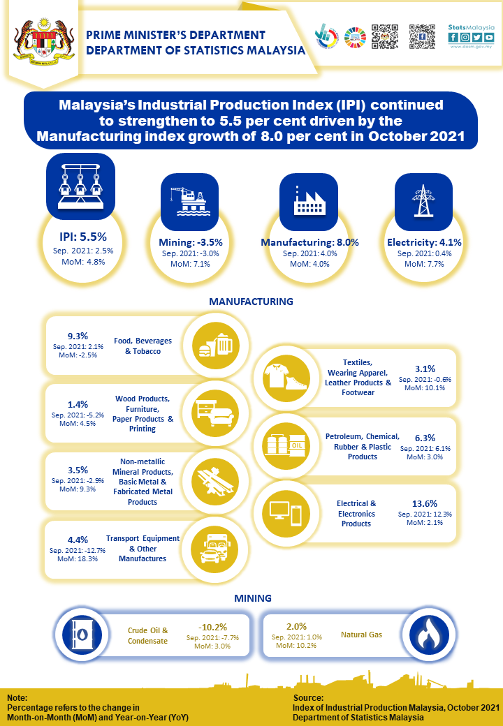 Malaysia’s Industrial Production Index (IPI) continued to strengthen to 5.5 per cent driven by the Manufacturing index growth of 8.0 per cent in October 2021