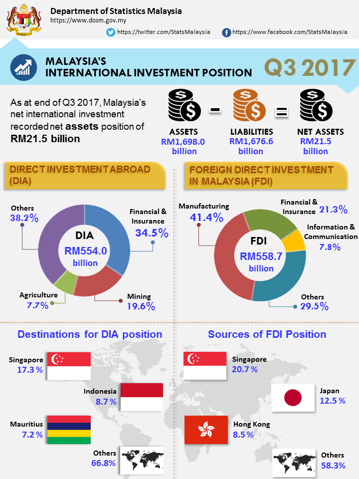 As at end of September 2017, the level of Malaysia’s net international investment recorded a net assets position of RM21.5 billion. Total financial assets position narrowed by 1.1 per cent to RM1,698.0 billion (Q2 2017: RM1,717.2 billion), while the total liabilities increased by RM1.8 billion to post RM1,676.6 billion (Q2 2017:RM1,674.8 billion). Direct Investment Abroad (DIA) position recorded RM554.0 billion at the end of Q3 2017 (Q2 2017: RM573.5 billion) and Foreign Direct Investment (FDI) in Malaysia posted a value of RM558.7 billion (Q2 2017: RM556.7 billion).