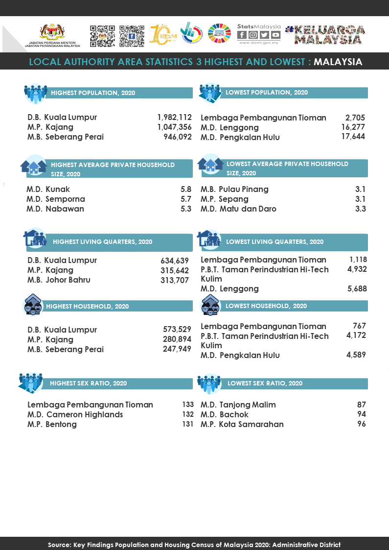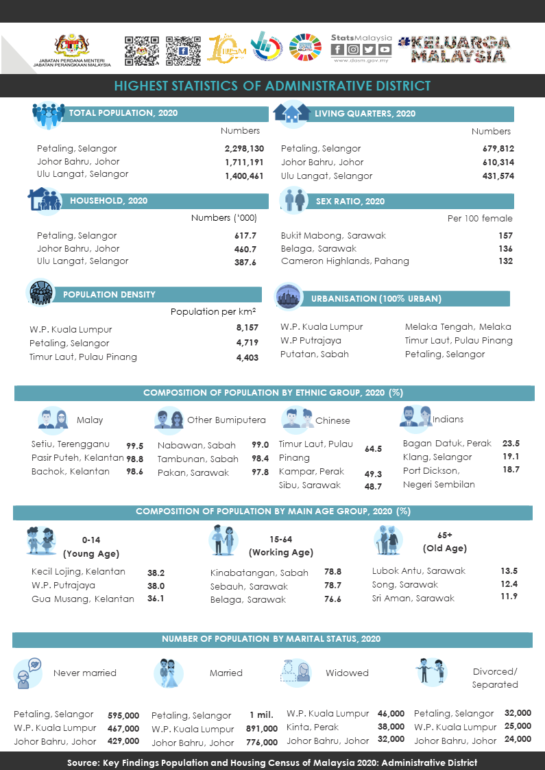 Key Findings Population and Housing of Malaysia 2020: Administrative District comprises statistics at small geographical levels namely administrative districts/ jajahan (160), mukim/ sub-districts (1,756) and Local Authority (PBT) (155). This key findings will be used in measuring the achievements of policy implementation by the government towards becoming a nation that achieves sustainable growth with fair and equitable distribution across income groups, ethnicities, regions and supply chains.