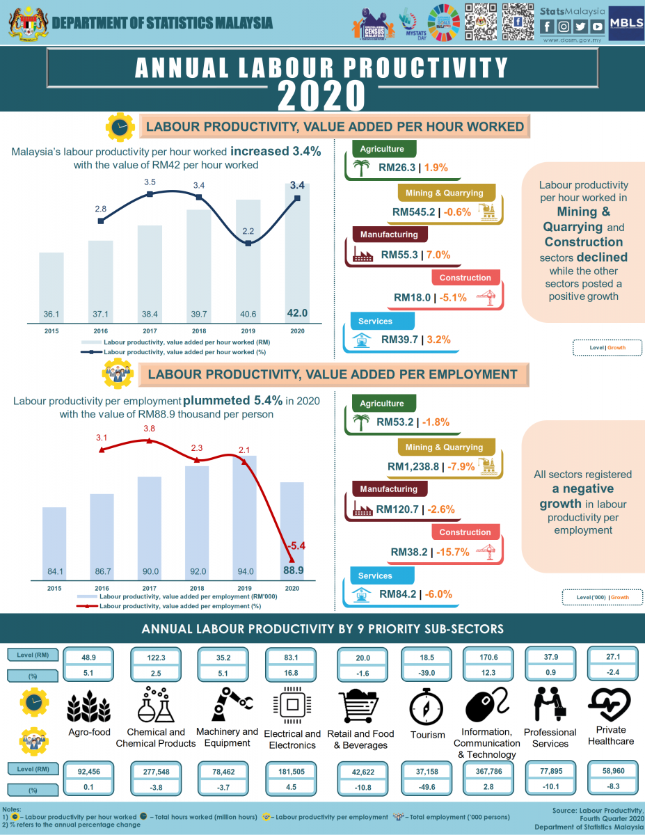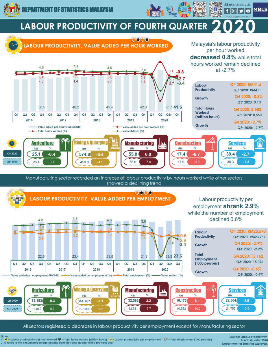 The detailed information and technical notes are published in the publication of Labour Productivity Fourth Quarter 2020. This report is accessible and downloadable free of charge through the eStatistik application in DOSM web page, www.dosm.gov.my.