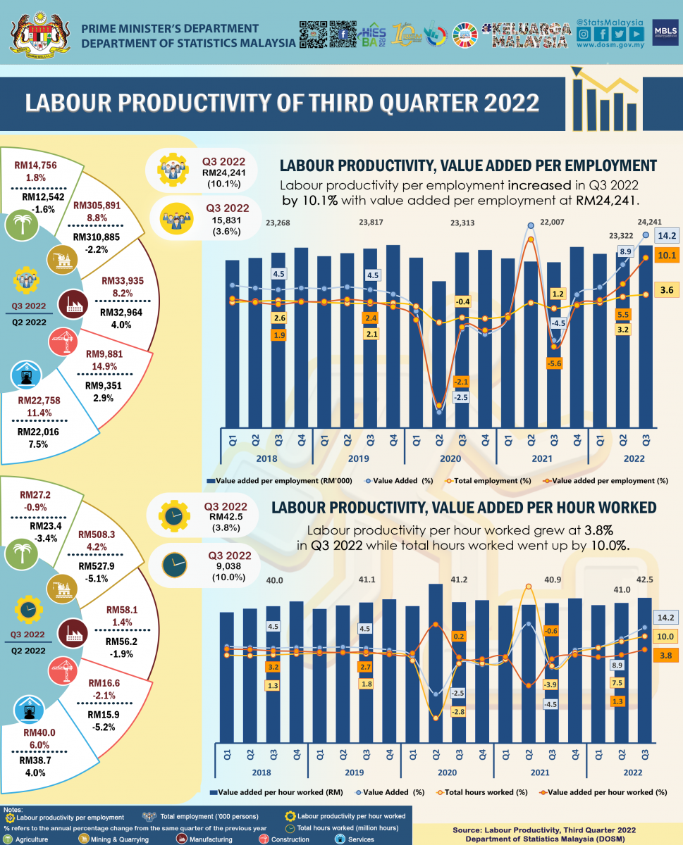 Malaysia’s labour productivity as expressed in terms of value added per hour worked improved 3.8 per cent, year-on-year as the country’s Gross Domestic Product (GDP) further expanded at 14.2 per cent as compared to 8.9 per cent in the last quarter, while total hours worked went up 10.0 per cent (Q2 2022: 7.5%). Total hours worked in the third quarter of 2022 was 9.0 billion (Q2 2022: 8.9 billion hours worked). Labour productivity as measured by value added per employment rose 10.1 per cent (Q2 2022: 5.5%), as total employment increased 3.6 per cent (Q2 2022: 3.2%). Total employment in the third quarter of 2022 was 15.8 million (Q2 2022: 15.7 million persons). In terms of level, labour productivity by value added per hour worked was RM42.5 (Q2 2022: RM41.0 per hour), while value added per employment was RM24,241 (Q2 2022: RM23,322 per person).
