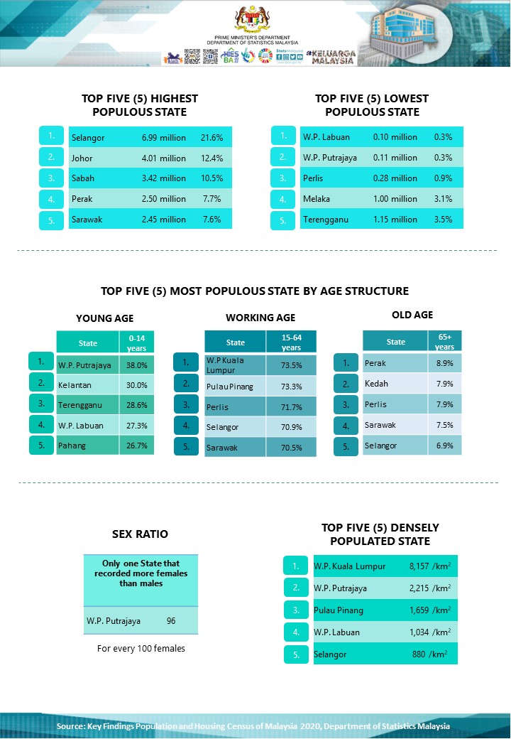 The highest young age population composition (0-14 years) by state was in W.P. Putrajaya (38.0%), Kelantan (30.0%) and Terengganu (28.6%). The composition of the working age population (15-64 years) was the highest in W.P. Kuala Lumpur (73.5%), Penang (73.3%) and Perlis (71.7%). The composition of the elderly population (65 years and over) was the highest in Perak (8.9%), Perlis and Kedah (7.9%) and Sarawak (7.5%). The oldest resident recorded was 120 years old male citizen and lives in Mersing, Johor.