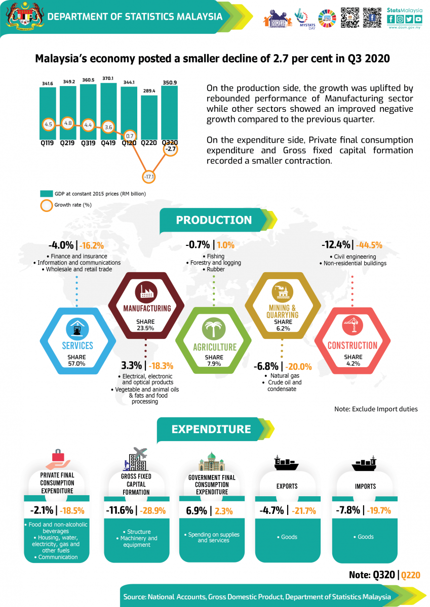 In the third quarter, the growth was uplifted by a rebounded performance of Manufacturing sector while other sectors showed an improved negative growth compared to the previous quarter. Overall, the performance in the third quarter was mainly driven by the Manufacturing sector which grew 3.3 per cent compared to the decline 18.3 per cent in the previous quarter, supported by Electrical, electronic & optical and Vegetable and animal oils & fats and food processing products. The favourable performance was attributed by exports-oriented industries which turnaround to 5.0 per cent (Q2 2020: -13.5%) and this was reflected in the performance of total exports in the month of September 2020 which recorded a positive double-digit growth.