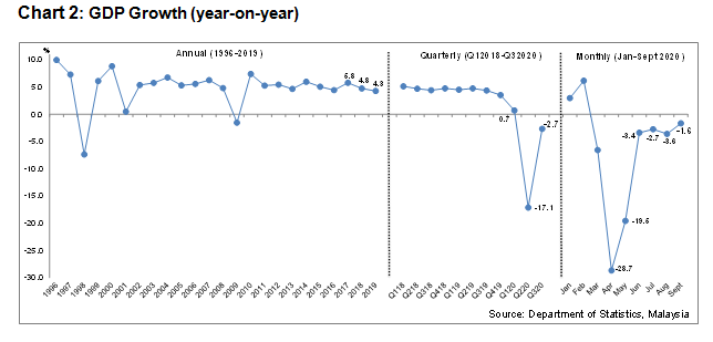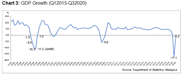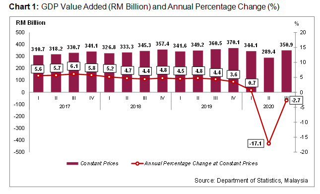 Malaysia’s GDP decreased at a slower pace of 2.7 per cent from the double-digit decline 17.1 per cent in the second quarter of 2020. The economic performance during this pandemic period is also measured on the monthly basis where July posted a lower decline 2.7 per cent, August contracted to negative 3.6 per cent while September improved to a smaller negative 1.6 per cent. On a quarter-on-quarter seasonally adjusted, GDP elevated to 18.2 per cent (Q2 2020: -16.5%).