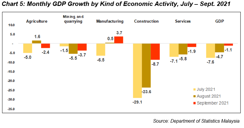 The economic performance in the third quarter of 2021 on the supply side was attributed by the downturn in all major economic sectors mainly Manufacturing and Services sectors. Meanwhile, on the demand side, all expenditure components experienced negative performance except for Government final consumption expenditure.