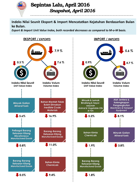In April 2016, Malaysia’s terms of trade rose 0.6% when compared with the preceding month, while a reduction of 2.6% was recorded year-on-year.